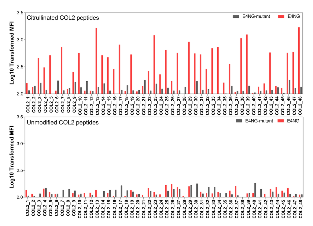 E4NG binds to citrullinated collagen type II (COL2) epitopes. E4NG-mutant is the control antibody that does not bind to citrulline. Binding to unmodified COL2 peptides is low by both E4NG and E4NG-mutant antibodies. Binding was determined by a multiplex flow immunoassay. (Results published in He et al Nat Comm 2023)