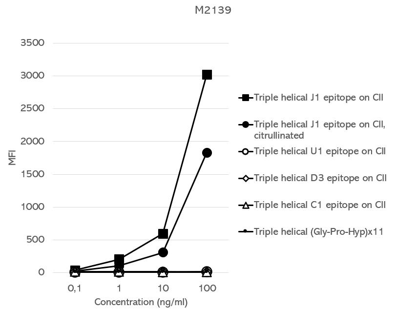 M2139 binds to the triple helical J1 epitope on collagen II. Binding to collagen II epitopes was determined in bead-based flow immunoassay as median fluorescence intensity (MFI). Triple helical (Gly-Pro-Hyp)x11 is a synthetic control peptide with 11 repeats of the Gly-Pro-Hyp sequence and mimics the collagen II backbone structure.